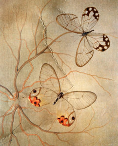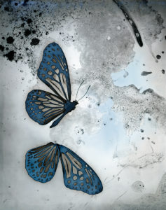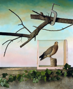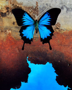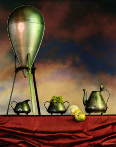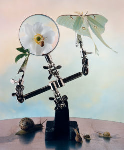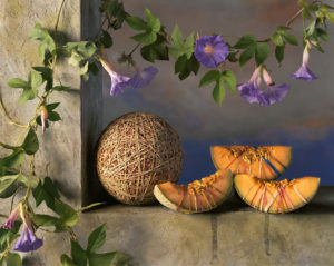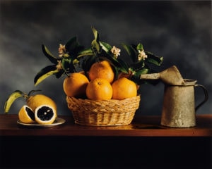 Jo Whaley combines the sensuality of painting with the veracity of the camera, and creates beautifully baroque photographic tableaux still life works. With a definiteness of line, a subtlety of form, and a brilliance and fullness of color and light, Whaley’s depictions of nature are equally descriptively clear, as they are powerfully abstract, capturing the dissonance between the organic and the artificial, while meditating upon the oxymoron of the “still-life” genre. It was her work as a scenic artist for the San Francisco Opera and other Bay Area theatrical companies that imbued her work with these theatrical sensibilities. Of her work the artist explains “It naturally occurred.  I was working on sets in the theater, and I started creating sets in my studio, which was in an old Dutch Boy paint factory in East Oakland.  For the early photographs, I painted backdrops, as in the theater—the tabletop for the still life became the proscenium stage.  The objects were the actors on the stage and their placement became the dialogue.”